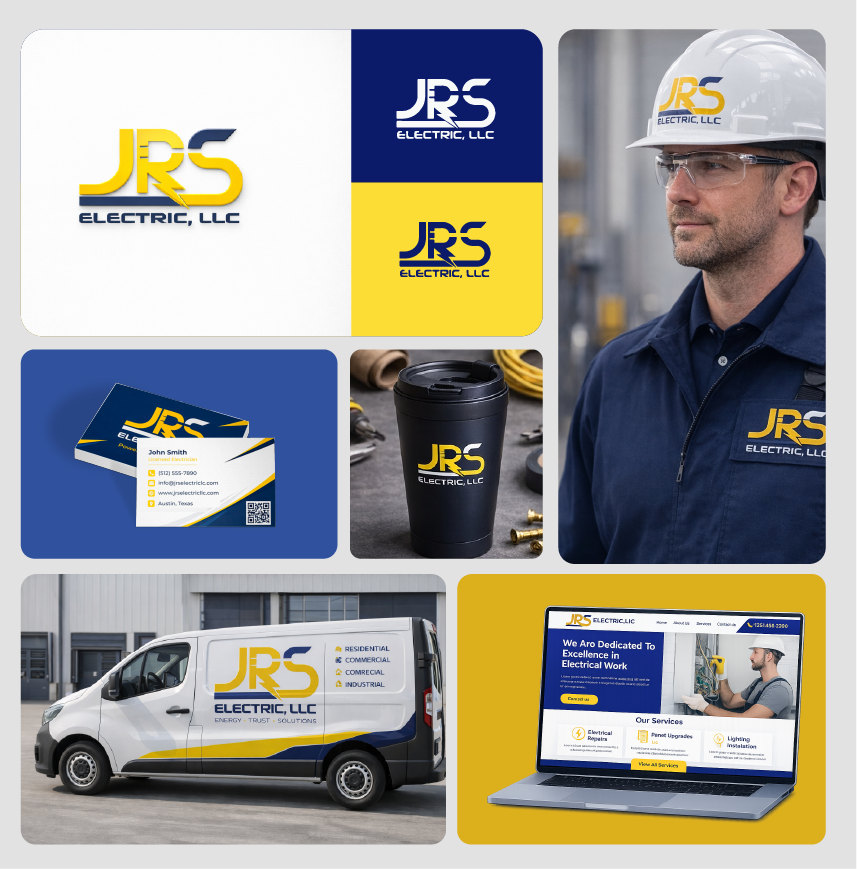 Desarrollo de identidad visual completa para JRS Electric LLC, una empresa orientada a servicios eléctricos residenciales, comerciales e industriales localizada en Estados Unidos.